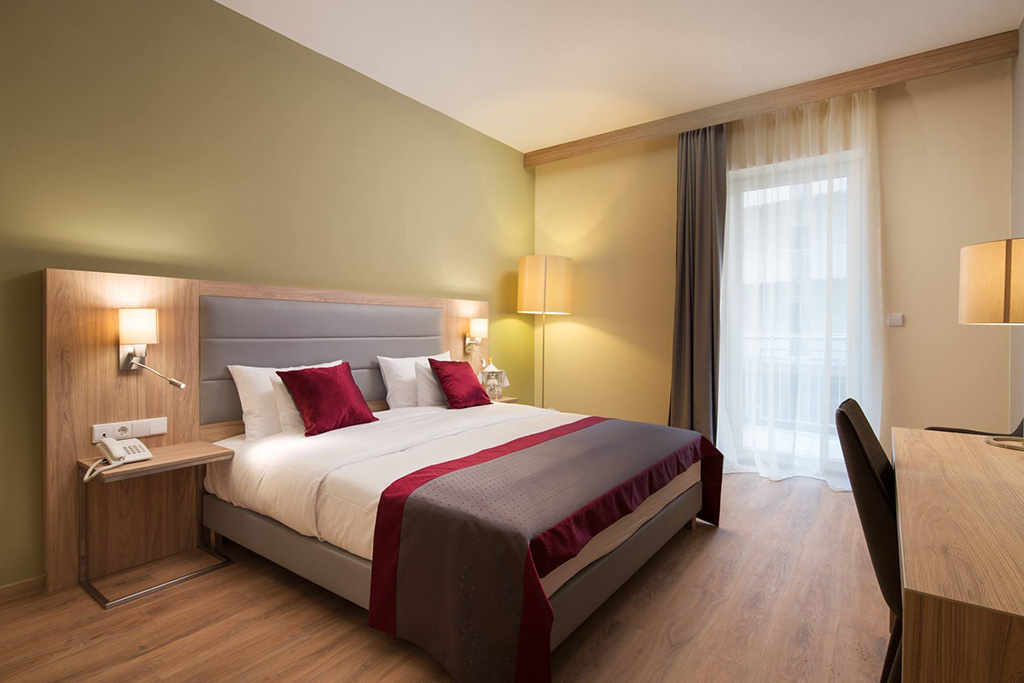 The Hotel has 198 rooms – standard, superior, deluxe twin/double rooms and suite – perfect harmony combining modern young style. The hotel welcomes guests, providing business and tailor-made services with four well-equipped conference rooms up to 200 people, Restaurant with terrace and underground private parking.